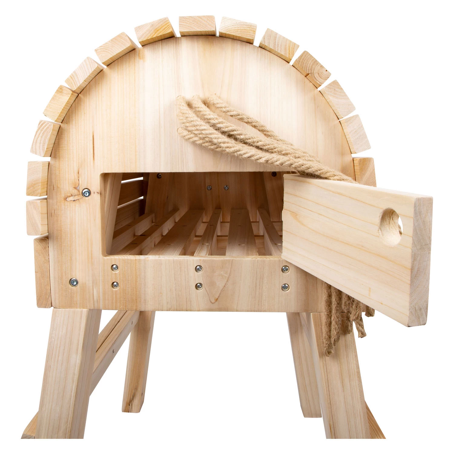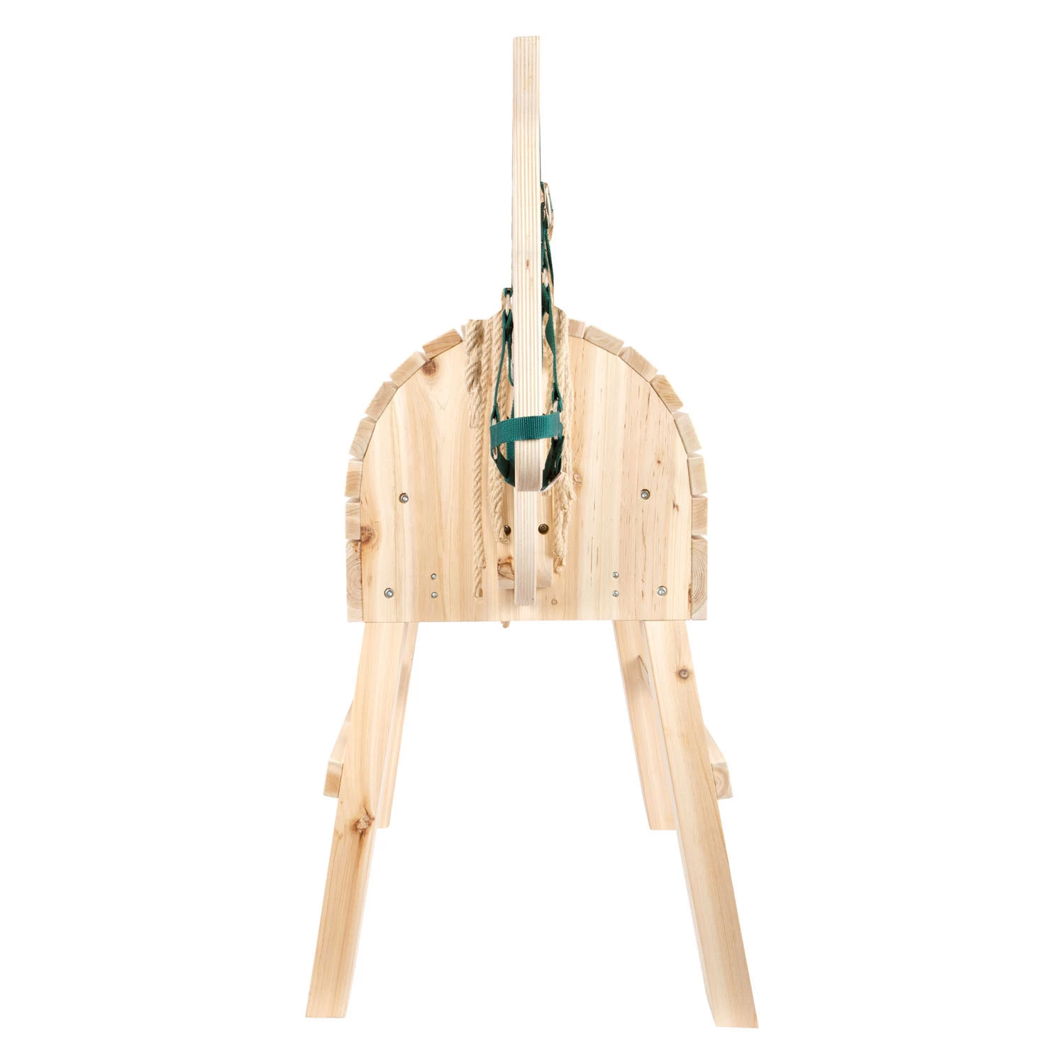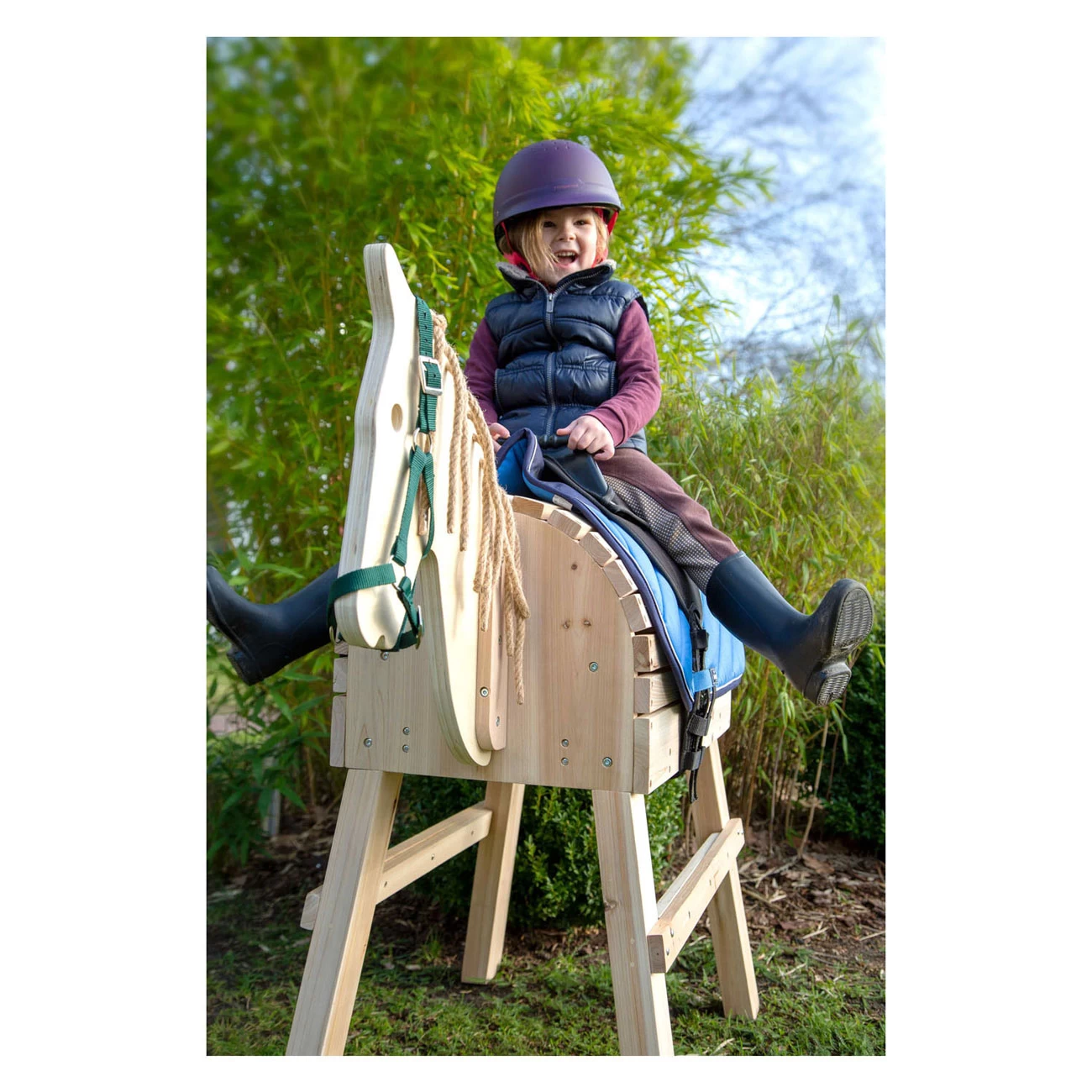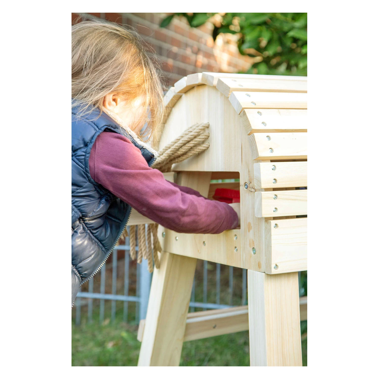 Ein Holzpferd ist das beste Geschenk für alle Pferdeliebhaber! Mit diesem großen Spiel-, Reit- und Springpferd aus unbehandeltem, witterungsbeständigem Holz können sowohl kleine als auch größere Reiter spielerisch die Grundlagen des Pferde-, Pony- und Reitsports erlernen. Die Mähne und der Schweif aus Sisal laden Kinder zum Stylen und Flechten ein, und eine Stufe erleichtert kleinen Kindern den Aufstieg auf das Pferd. Die ausgestellten Beine sorgen für einen stabilen, sicheren Stand. Und das Besondere: Hinter der Klapptür auf der Rückseite befindet sich im Bauch des Pferdes ein großer Stauraum, in dem Halfter, Putzutensilien und Zubehör untergebracht werden können. Kommt mit einem Halfter! Ideal für den Garten oder das Kinderzimmer. Die Größe des Pferderückens wurde so konzipiert, dass er zu einem echten Sattel und einer Unterlage passt. Für eine dauerhafte Nutzung kann das unbehandelte Holz je nach Bedarf und Wunsch des Anwenders mit einem Holzschutzlack behandelt werden.