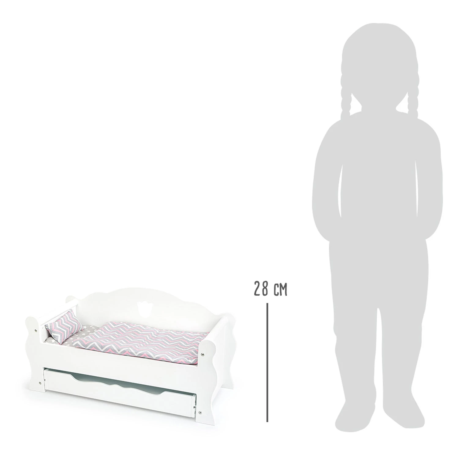 Jetzt wird es lustig! Das Puppenbett lässt sich in ein bequemes Sofa verwandeln. In der praktischen Schublade lässt sich nicht nur die süße Bettwäsche verstauen, sondern auch als zweiter Schlafplatz nutzen.