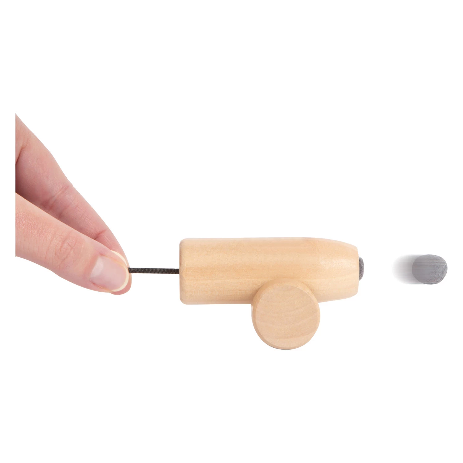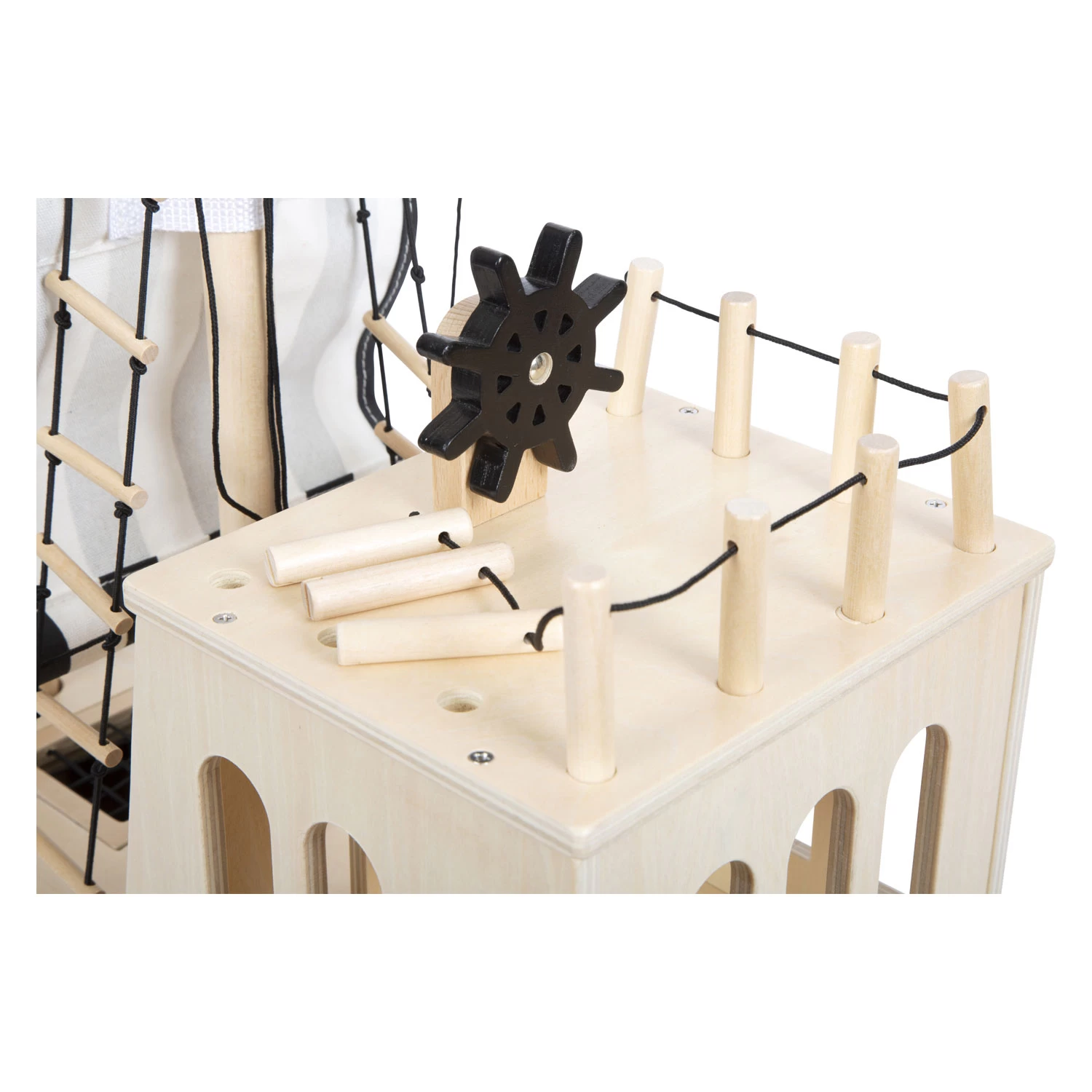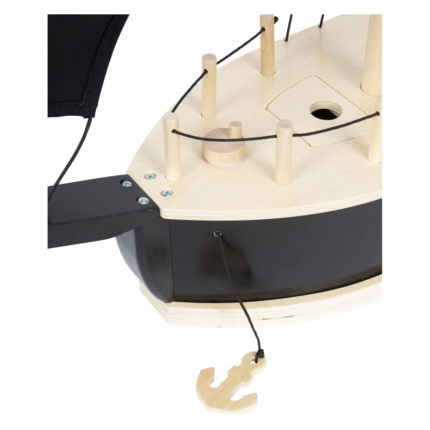 Ahoi Piraten! Dieses detailreiche Piratenschiff aus robustem Holz lässt mit vielen authentischen Details Wünsche wahr werden! Das umfangreiche Spielset enthält neben dem geräumigen Zweimasterschiff auch ein Beiboot, mit dem zwei Biegepuppen rudern können, einen Hai, einen Papagei, eine Schatzkiste, eine Kanone, zwei Fässer, eine Planke und natürlich eine coole Piratenflagge . Alle Segel lassen sich wie auf einem echten Schiff mit Seilen hissen und hissen. Für noch mehr Spielspaß sorgt die Kanone, die ihre drei Filz-Kanonenkugeln durch die Luft schießt!