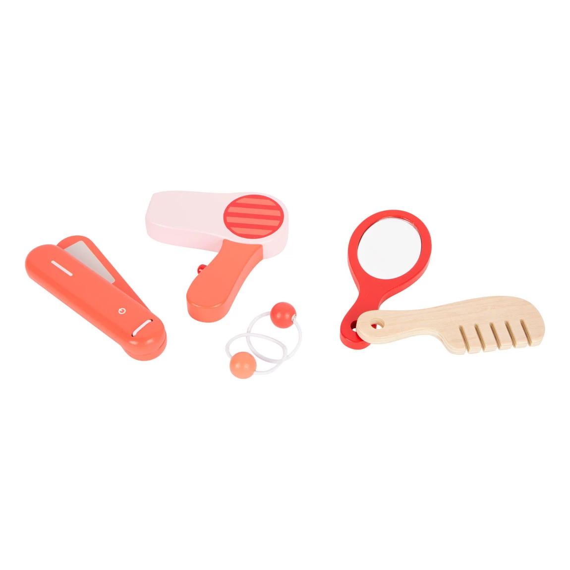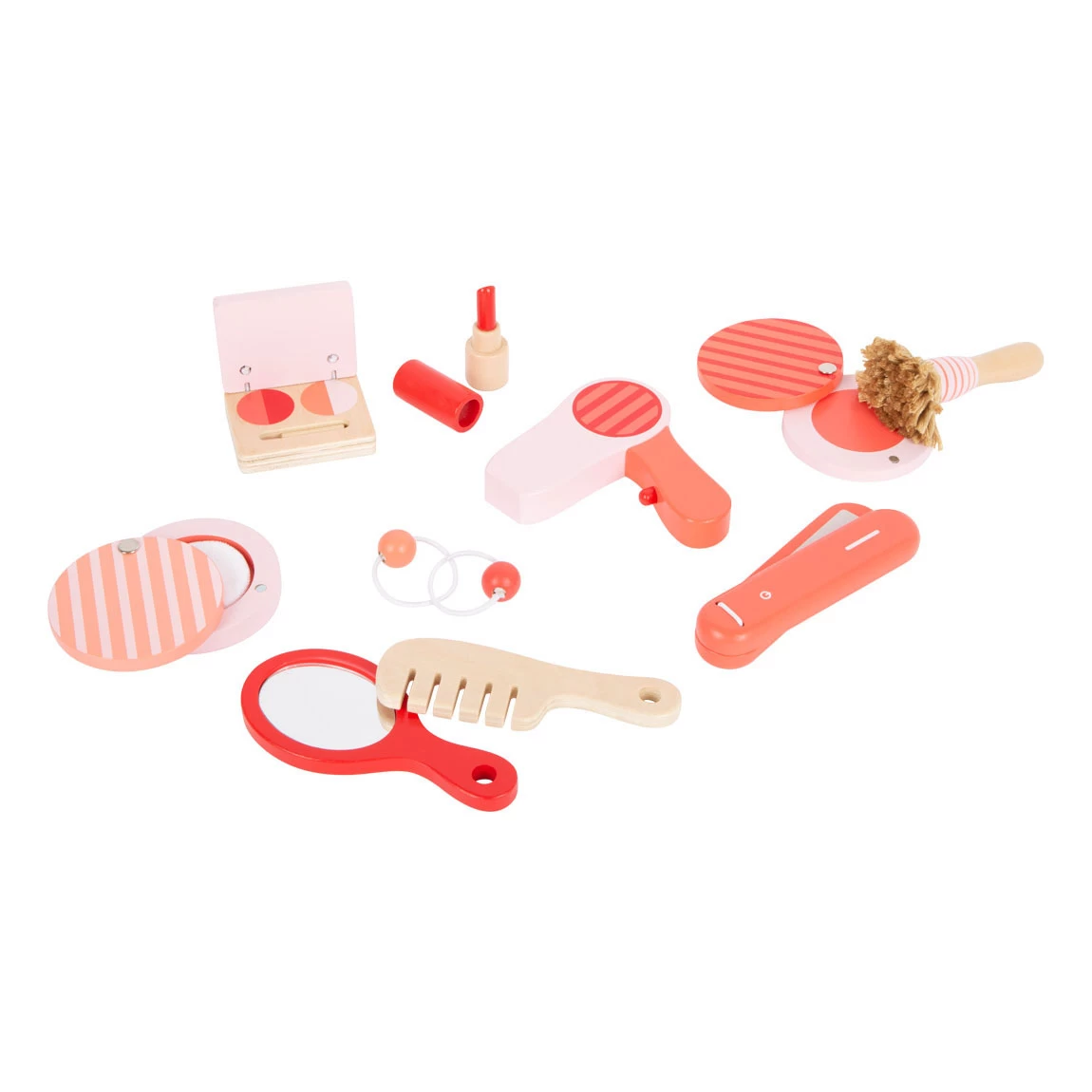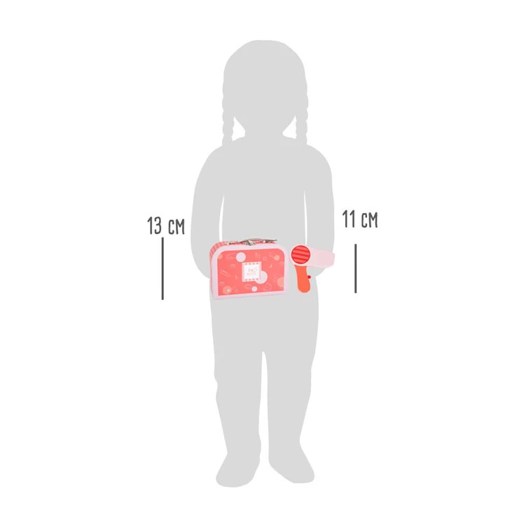 An alle Visagisten aufgepasst! Dieses umfangreiche Spielset besteht aus allerlei Make-up- und Haarpflegeutensilien wie Puder, Rouge, einem Puderpinsel, Lippenstift, einem Handspiegel, Lidschatten, Haarglätter, Föhn, Kamm und richtig elastischen Haarbändern zum Stylen der Haare. Wird in einem stabilen Make-up-Etui mit den Maßen 19 x 13 cm geliefert, ideal für unterwegs.