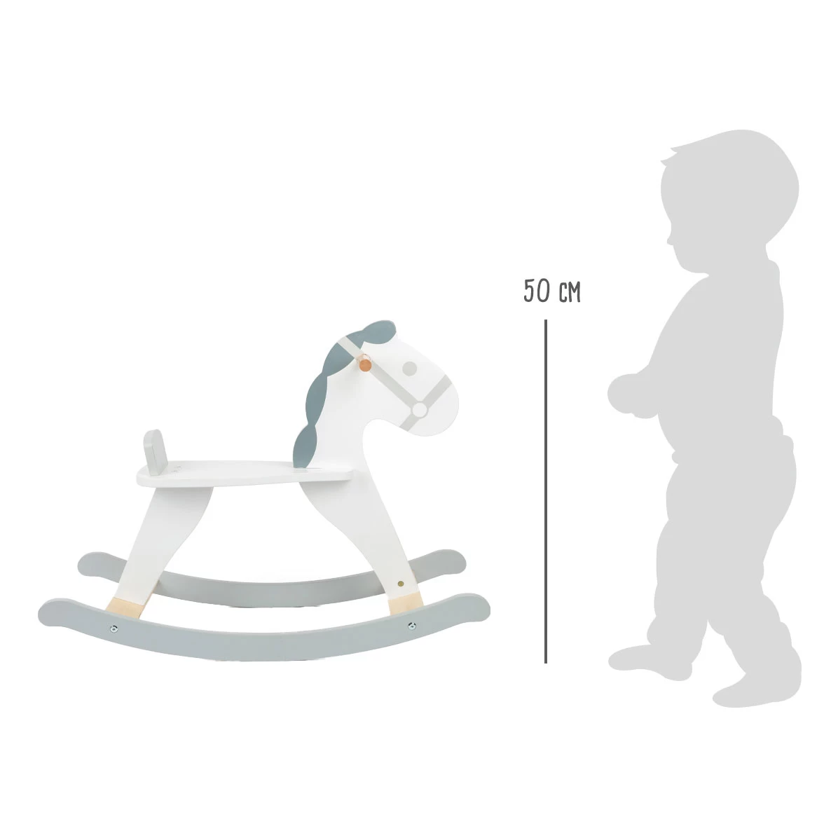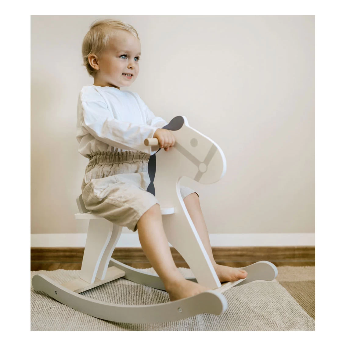 Dieses Schaukelpferd im modernen skandinavischen Stil verzaubert Kunden mit seinem dezenten grau-weißen Design. Das kleine Pferd mit freundlichem Gesicht lädt Kinder zu lustigen Ausritten ein und ist auch eine schöne Dekoration für das Kinderzimmer. Während die Kleinen schaukeln, sorgen eine Rückenlehne und praktische Griffe für einen festen Halt im Sattel. Aus stabilem Sperrholz und Massivholz gefertigt, sorgt dieses Schaukelpferd für wilde Fahrten durchs Kinderzimmer und langanhaltenden Reitspaß. Ein klassisches Spielzeug in moderner Aufmachung, das in jedes Kinderzimmer gehört!
