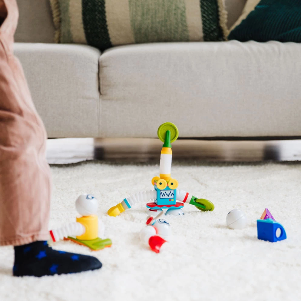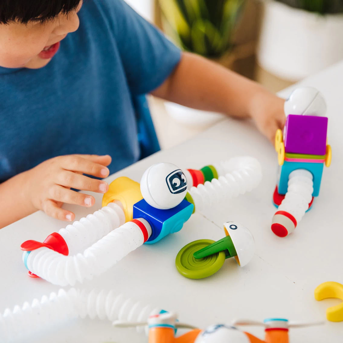 Augen, Flügel, Räder, Propeller, Gesichter, Hände … Mix & Kombiniere alle Teile und erstelle jeden Roboter, den du willst. Ihre Kreationen werden dank der neuen ausziehbaren Stangen, die um mehr als 10 cm verlängert werden können, supercool aussehen. Diese flexible Stange bietet ein neues Maß an Spiel, lassen Sie Ihrer Fantasie freien Lauf und schaffen Sie Kreationen, die bisher undenkbar waren.