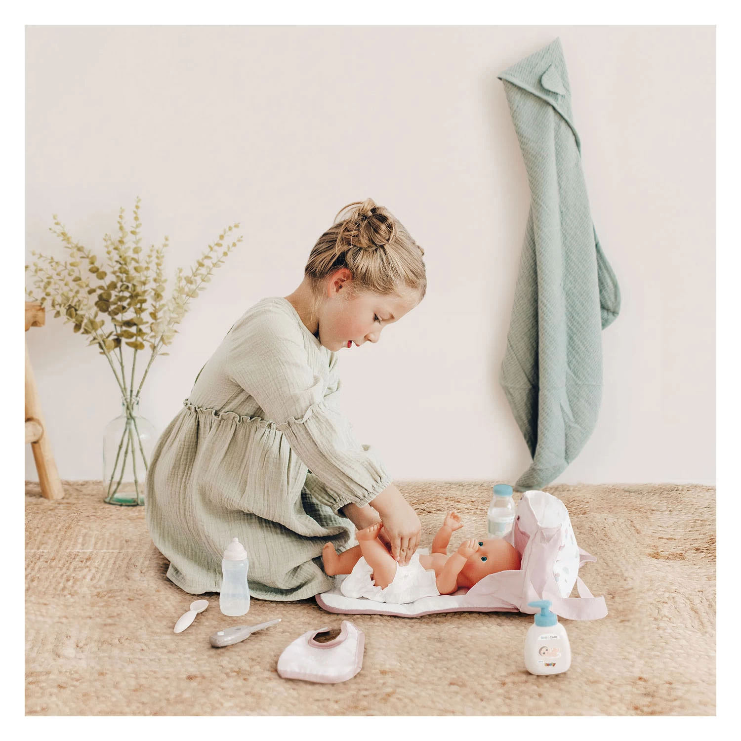 Mit dieser praktischen Wickeltasche von Smoby Baby Nurse hat Ihre Mini-Mama oder Ihr Mini-Papa alles griffbereit, um mit der Babypuppe rauszugehen. Die Tasche lässt sich zu einer praktischen Wickelunterlage zusammenfalten. In der Tasche können Sie problemlos alle wichtigen Dinge verstauen: eine Trinkflasche, eine Wickelunterlage, ein Lätzchen, ein Thermometer, eine Flasche Sirup mit Löffel und eine Flasche Pflegelotion.