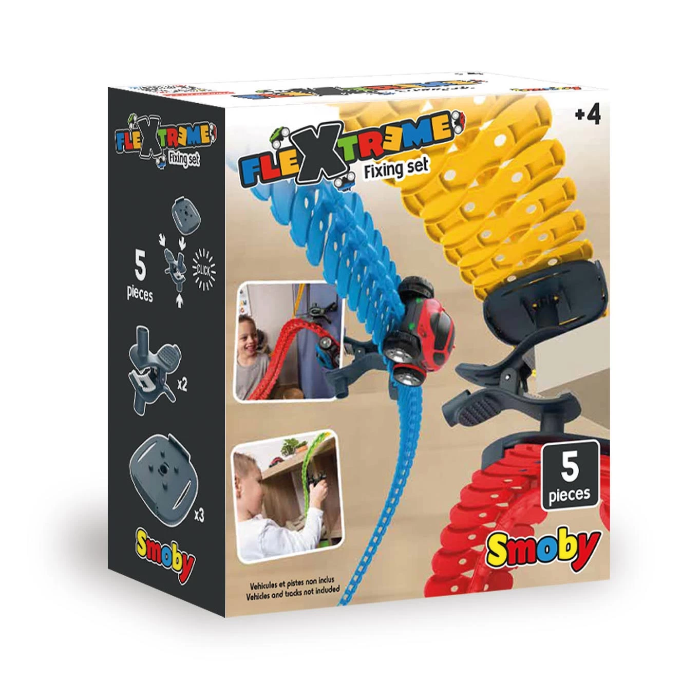 Mit Hilfe dieses Montagesets können Sie Ihre FleXtreme-Rennstrecke noch einfacher XTREME machen! Mit Klemmen und Schienenhaltern können Sie Schienen noch einfacher und freier an Tischen, Stühlen und anderen Möbeln befestigen. Smoby FleXtreme, die flexible Rennstrecke Machen Sie eine Schleife, drehen Sie die Strecke um oder überqueren Sie sie vom Tisch zum Stuhl. Mit der Smoby FleXtreme-Rennstrecke ist nichts zu verrückt. Der Schienenträger kann an einem der 3 verfügbaren Befestigungspunkte an der Klemme montiert werden. Darüber hinaus ermöglicht seine Form eine vollständige Kontrolle über die Biegung der Strecke. So beugen Sie den Risiken des Loslassens vor! Die Klemme kann auf verschiedene Arten befestigt werden und ist für bis zu 3 Schienenhalter gleichzeitig geeignet. Geeignet für Kinder ab 4 Jahren.