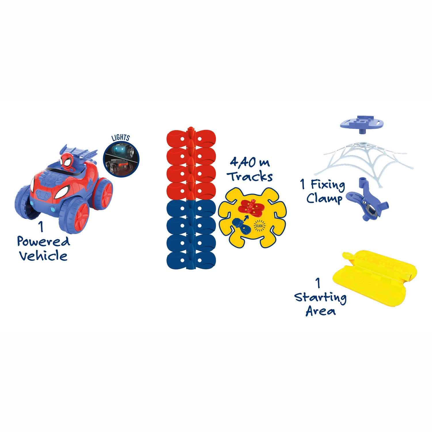 • Inhalt: 4,4 Meter Gleis, 1 leuchtendes elektronisches Spidey-Fahrzeug, 1 Start- und Zielteil und 1 Montageklemme.