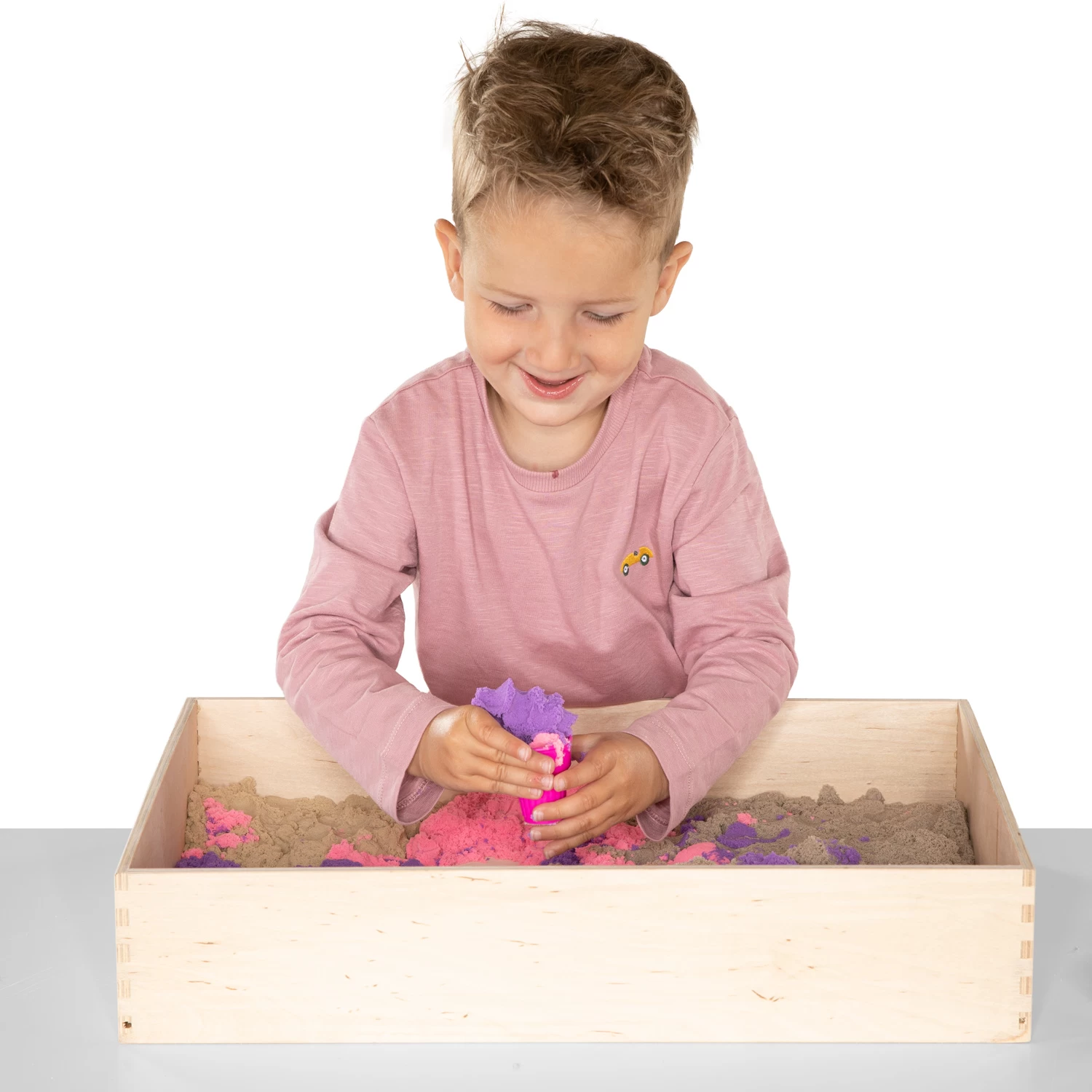 Handliche große Spielkiste aus Holz, ideal zum Spielen und Bewegungssand! So können Sie das Basteln und Spielen mit kinetischem Sand drinnen am Tisch genießen, ohne dass es zu Unordnung kommt. Durch den kleinen erhöhten Rand bleibt der Sand an Ort und Stelle und kann anschließend einfach wieder in den Eimer gegeben werden. Die Spielbox eignet sich auch ideal zum Gestalten einer Sinnesbox. Legen Sie kleine Dinge in die Holzkiste, mit denen Kinder ihre Sinne anregen können. Füllen Sie den Behälter beispielsweise mit getrocknetem Reis oder Bohnen und fügen Sie kleine Spielfiguren hinzu. Dies ermöglicht ein wunderbares Spielen und Fühlen und regt die sensomotorische Entwicklung der Kinder an.