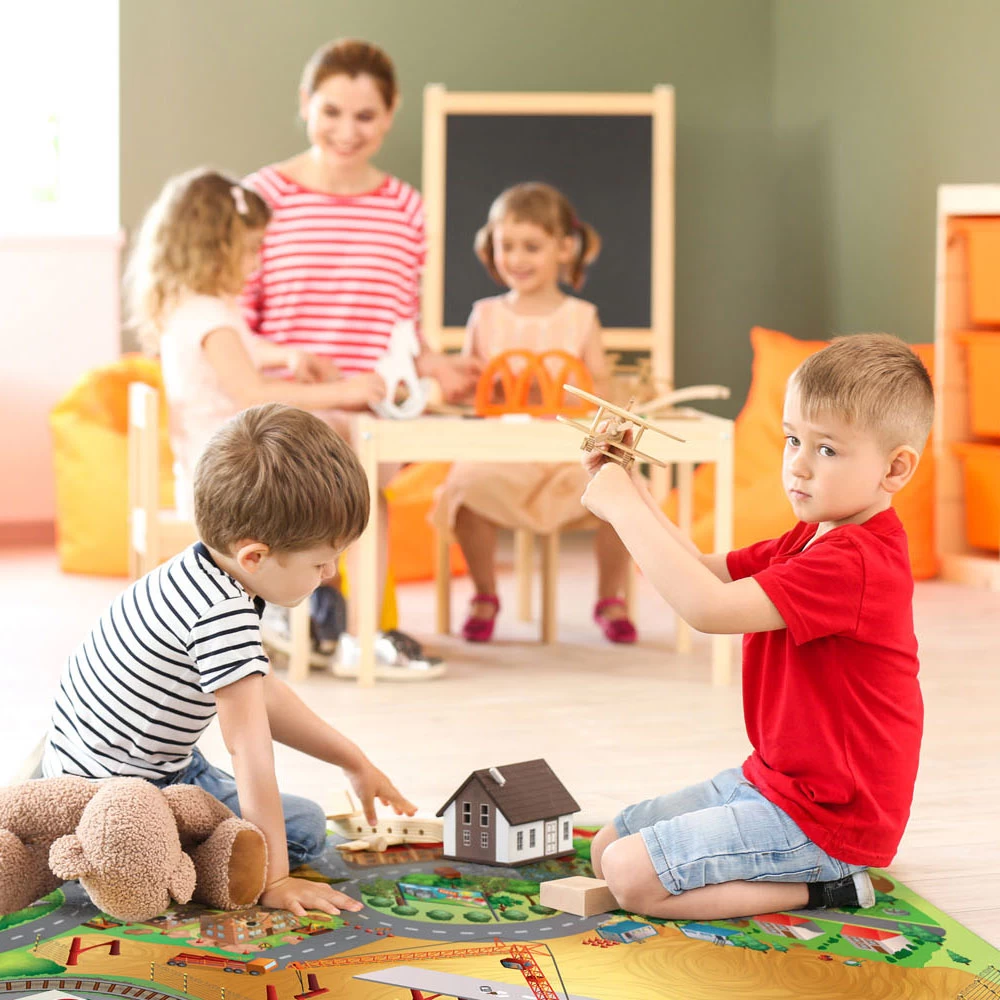 Auf dieser Spielmatte sehen Sie eine Stadt im Bau. Auf der Baustelle wird viel gebaut! Es wird ein Viadukt geben, Ausgrabungen werden mit Baggern durchgeführt und es wird eine Bahnstrecke geben. Phthalatfrei. UV-beständig. Die Spielmatte ist 150 x 100 cm groß und hat auf der Unterseite eine rutschfeste Latexschicht. Geeignet für Kinder von 18 Monaten bis 6 Jahren.