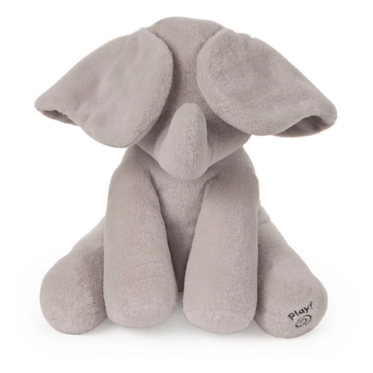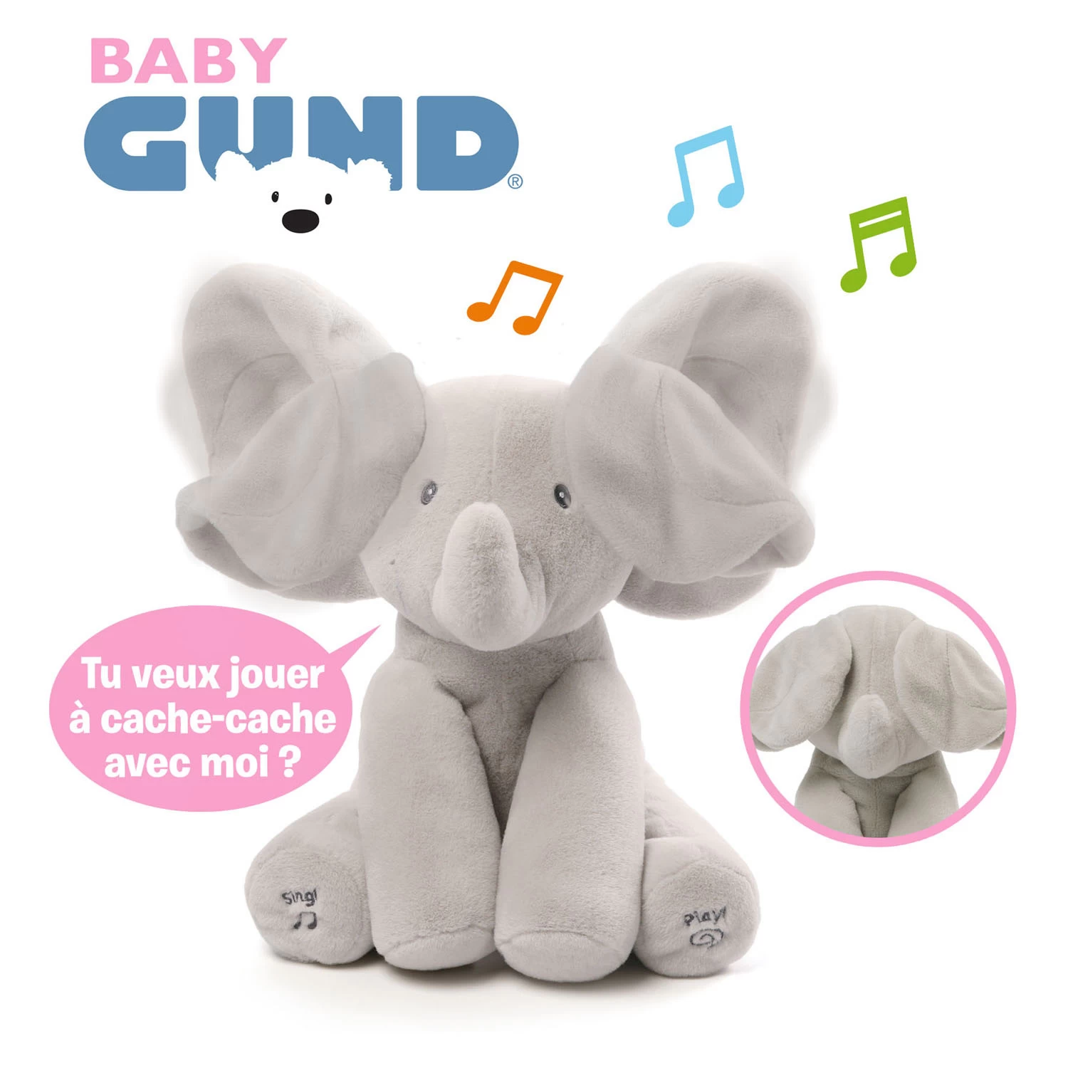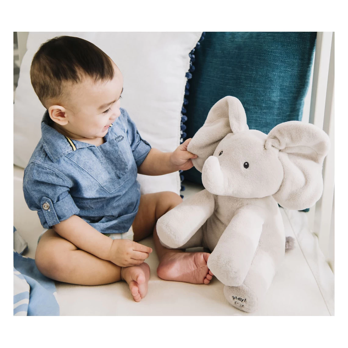 Hallo Baby. Flappy Der Elefant ist immer bereit, mit Ihrem Baby zu spielen. Bewegliches Plüschtier Flappy The Elephant von Baby Gund ist ein süßes bewegliches Plüschtier , das mit seinen großen Schlappohren Guck-Guck spielt. Drücken Sie seine Pfote, um ein interaktives Guck-Guck-Spiel zu aktivieren, bei dem Flappy spielt und mit einer süßen Kinderstimme mit Ihrem Baby spricht. Flappy, unser meistverkauftes Plüschtier mit gestickten Details, superweichen Pfoten und einem anschmiegsamen Körper, ist für alle Altersgruppen sicher und bereit, der beste Freund Ihres Babys zu werden.