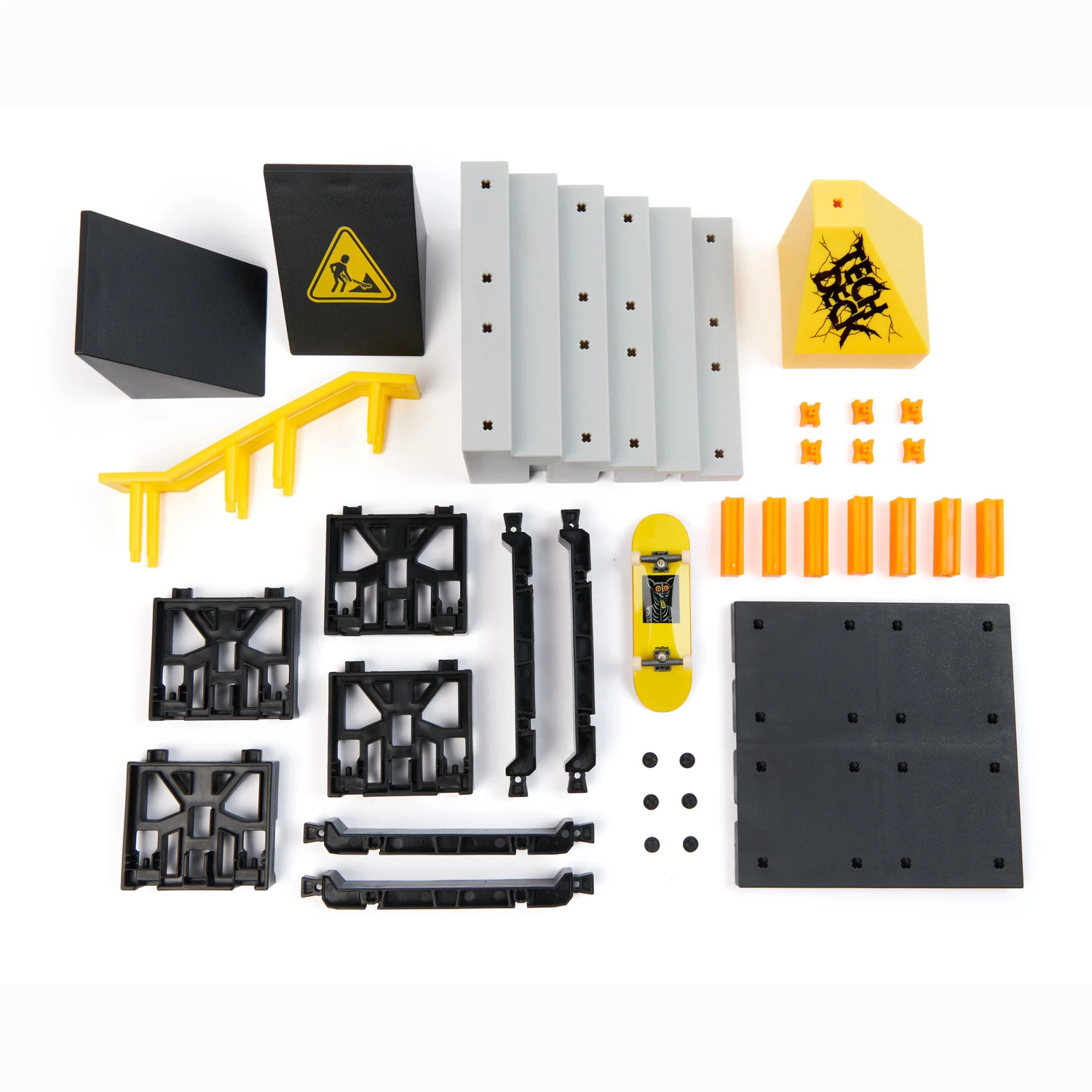 Inhalt: 1 Tech Deck Griffbrett, 1 kleine Pyramide, 1 Schiene, 2 Keilrampen, 1 quadratische Platte, 1 Treppe, 4 kleine Stützen, 4 Balken, 6 X-Verbinder, 7 große X-Verbinder, 6 Nivellierfüße, Gebrauchsanweisung