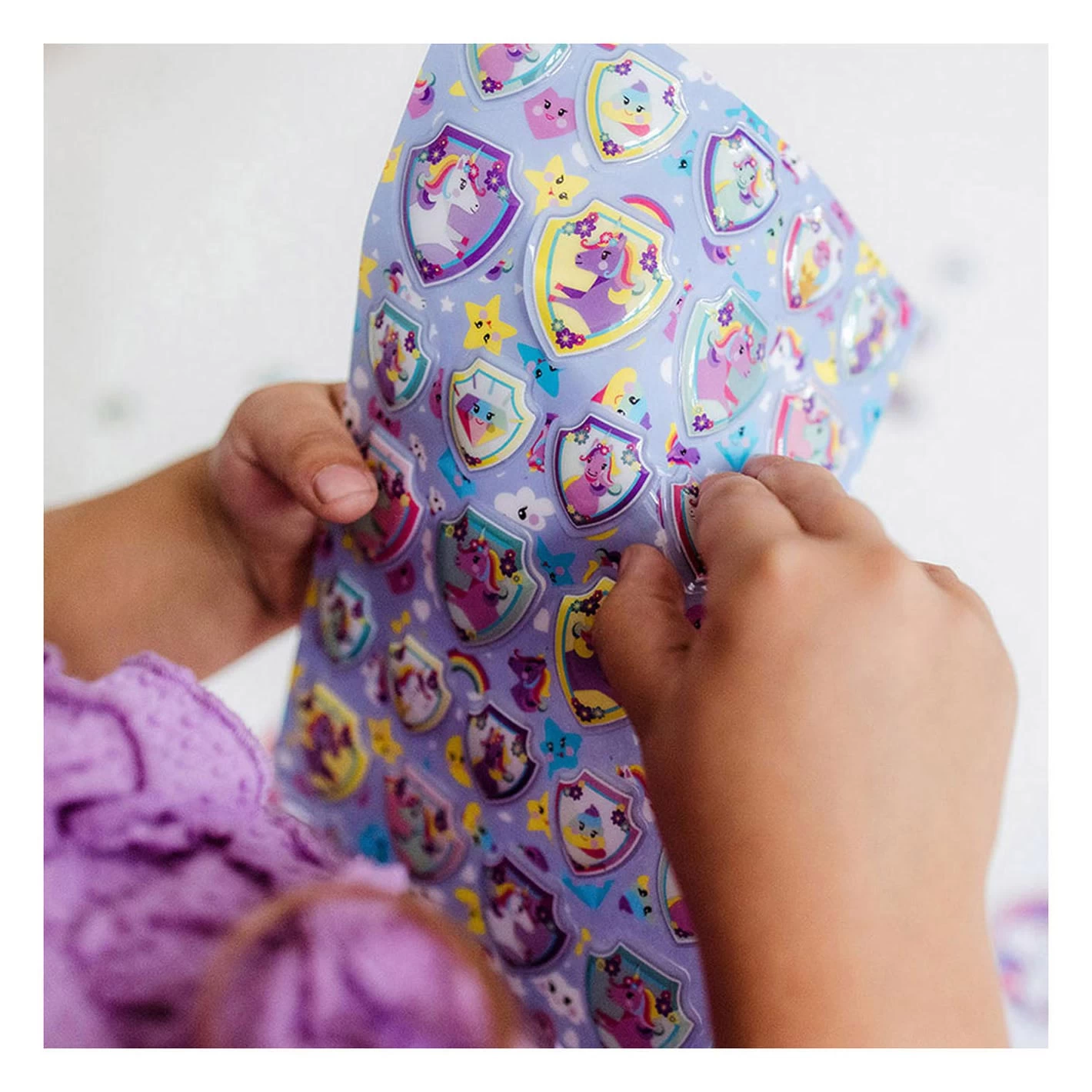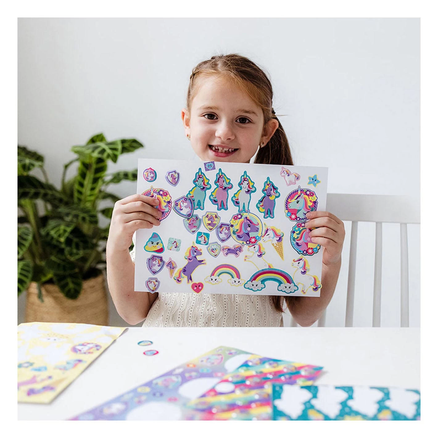 • 7 Aufkleberbögen in verschiedenen Größen mit Aufklebern von Einhörnern, Regenbögen, Blumen und mehr, darunter: