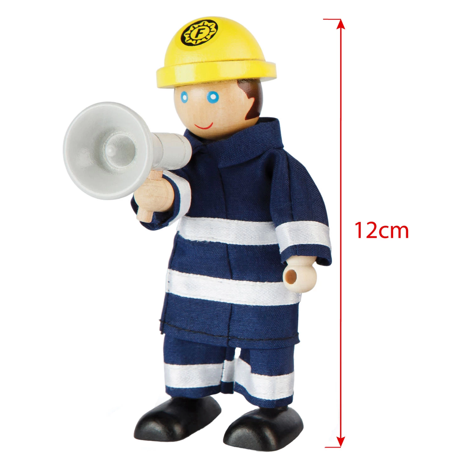Set aus vier Feuerwehr-Spielzeugfiguren, die bereit sind, zur Rettung zu eilen, Feuer zu löschen, Katzen von Bäumen zu retten und was die Fantasie sonst noch zulässt! Glücklich und einsatzbereit sind die Feuerwehrleute für den Tag der Brandbekämpfung gekleidet. Mit flexiblen, beweglichen Armen und Beinen kann jede der Holzpuppen stehen oder sitzen – so ist keine Rettungsmission ausgeschlossen! Diese Feuerwehrleute verfügen über Zubehör wie eine Axt, ein Megafon, einen Feuerlöscher und ein Atemschutzgerät. Feuerwehrspielzeug fördert kreatives und fantasievolles Spielen. Entwickelt die Hand-Auge-Koordination, Feinmotorik und Geschicklichkeit. Hergestellt aus hochwertigen, verantwortungsvollen Materialien. Entspricht den aktuellen europäischen Sicherheitsstandards. Die Figuren sind 12 Zentimeter hoch. Geeignet für Kinder ab 3 Jahren. Bigjigs Holzspielzeug Das erste Bigjigs Spielzeug wurde 1985 auf englischem Boden kunstvoll aus wunderschönem Holz hergestellt. Auch heute noch ist Holz das ultimative Material für Bigjigs Spielzeuge. Nach Jahren des Erwerbs von Wissen und Fähigkeiten ist ein würdiges Sortiment an Holzspielzeug aller Art entstanden. Entdecken Sie Holzeisenbahnschienen, Holzlebensmittel, Holzpuzzles und vieles mehr!
