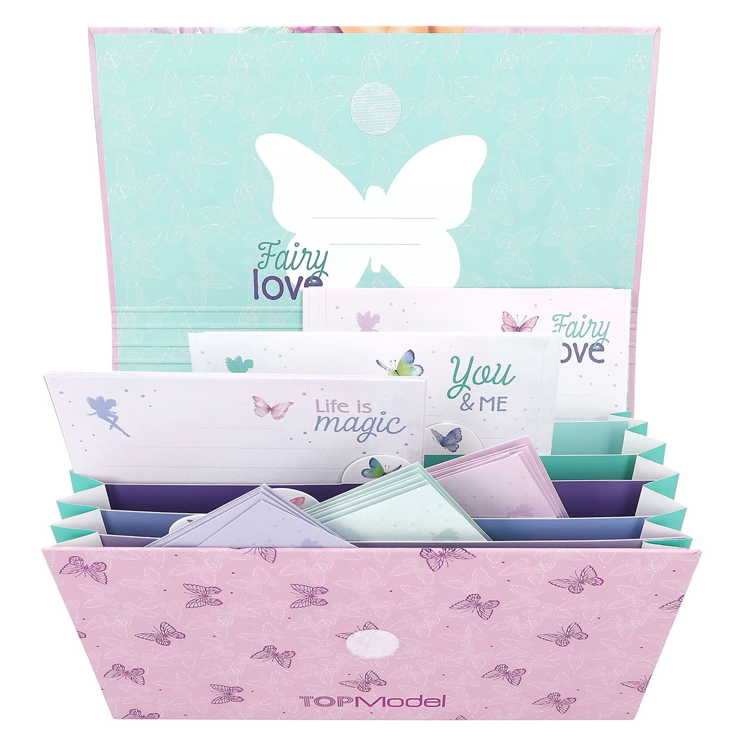 Zauberhaft schön: Auf dieser wunderschönen TOPModel Briefpapier macht es doppelt so viel Spaß, einer besonderen Person eine Nachricht zu senden. Wunderschöne Pastelltöne, sanfte Schmetterlinge und märchenhafte Modelle. Das Set besteht aus 24 Blatt Briefpapier (3 verschiedene Designs) und 18 passenden Umschlägen. Alles verpackt in einer praktischen Aufbewahrungsmappe.