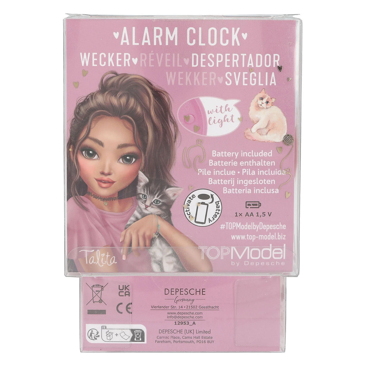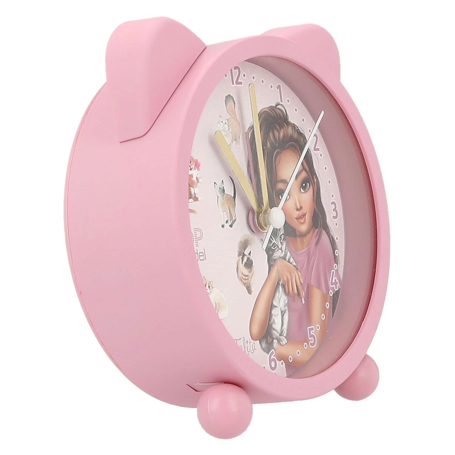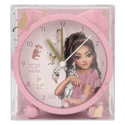 Katzenzeit! Der rosa TOPModel Wecker hat ein wunderschönes Bild eines Models mit einer süßen Katze auf dem Zifferblatt. Mit lustigen Ohren, goldenen Zeigern und einer praktischen Lichtfunktion, um zu sehen, wie spät es nachts ist. Der Wecker enthält eine Batterie (AA 1,5 V), die nur aktiviert werden muss und austauschbar ist. Durchmesser: ca. 11 cm.
