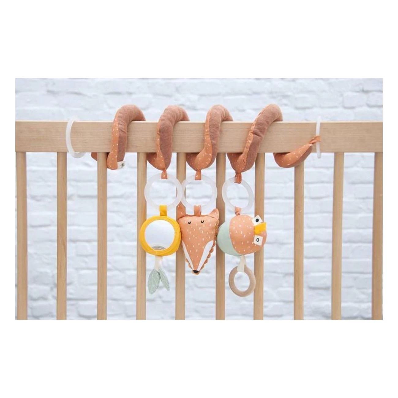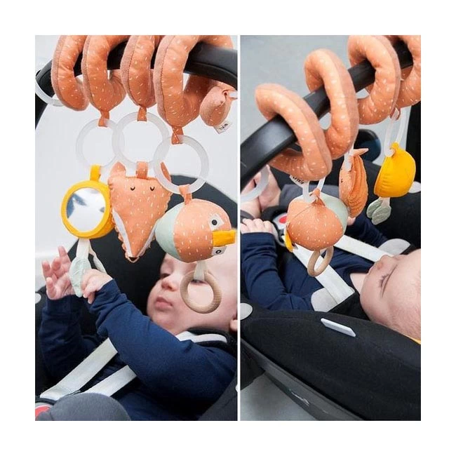 Mit drei spielerischen Elementen zum Entdecken zaubert diese Aktivitätsspirale ein Lächeln auf jedes Gesicht! Die Spirale windet sich wunderschön um jeden Kinderstuhl oder Park. Die drei Spielzeuge haben jeweils unterschiedliche Eigenschaften, wie zum Beispiel einen Holzring, Knisterpapier, einen Spiegel und eine Glocke. Da alle Elemente mit praktischen Ringen befestigt sind, können Sie sie auch einfach abnehmen und separat verwenden.