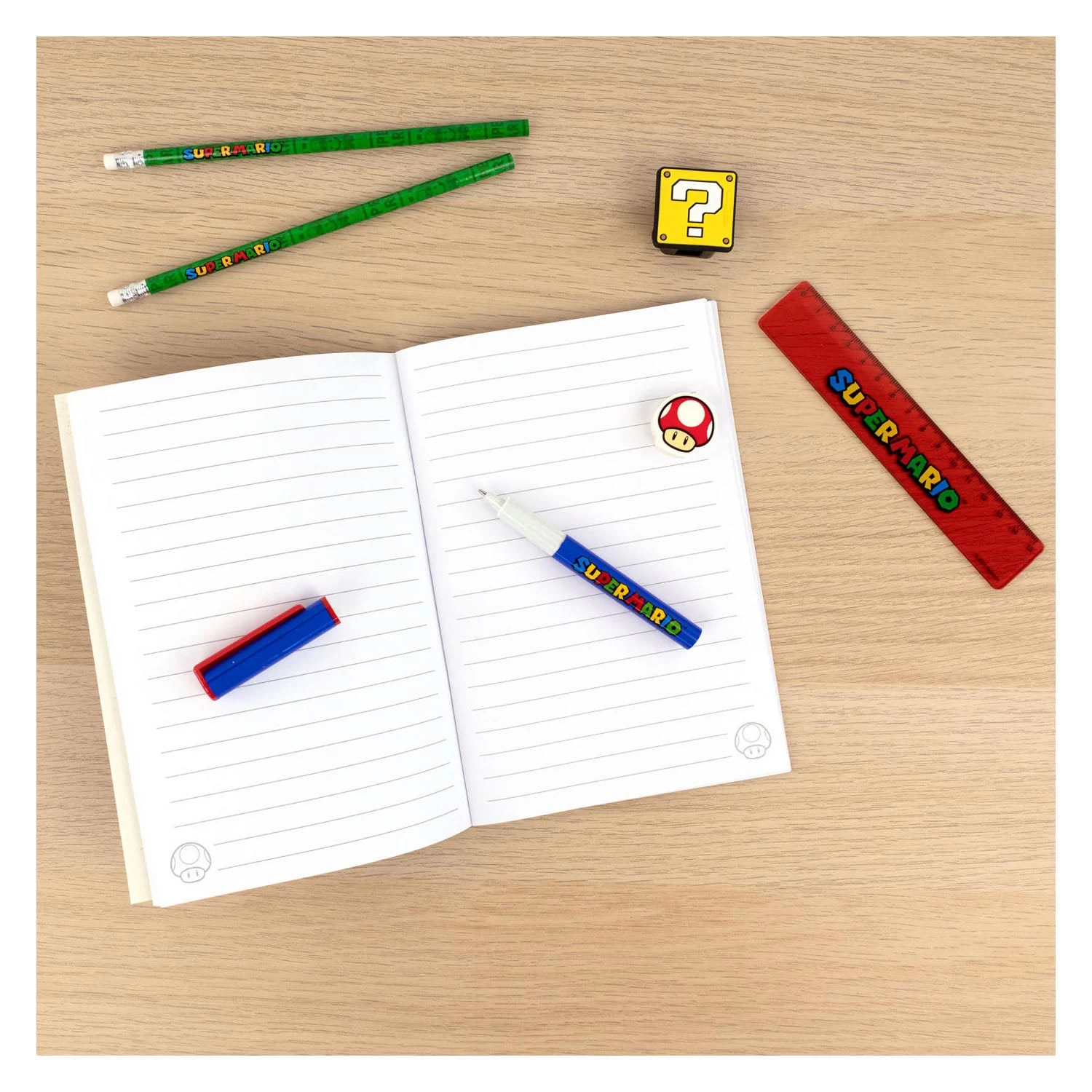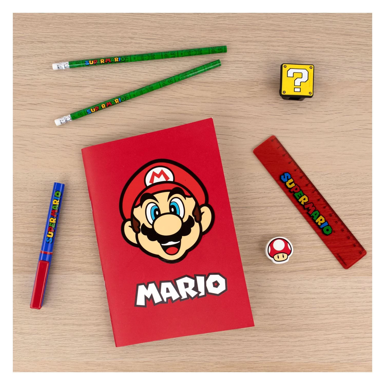 Mit diesem Super Mario Schreibset können Sie tolle Schriften anfertigen! Dieses 7-teilige Set besteht aus einem Mario-Notizblock, einem Kugelschreiber, zwei Bleistiften, einem Radiergummi, einem Bleistiftspitzer und einem Lineal. Der Radiergummi hat die Form des bekannten Super Mario Pilzes und der Bleistiftspitzer hat die Form eines ikonischen Fragezeichenblocks aus den Spielen. Der Schreibblock ist liniert.