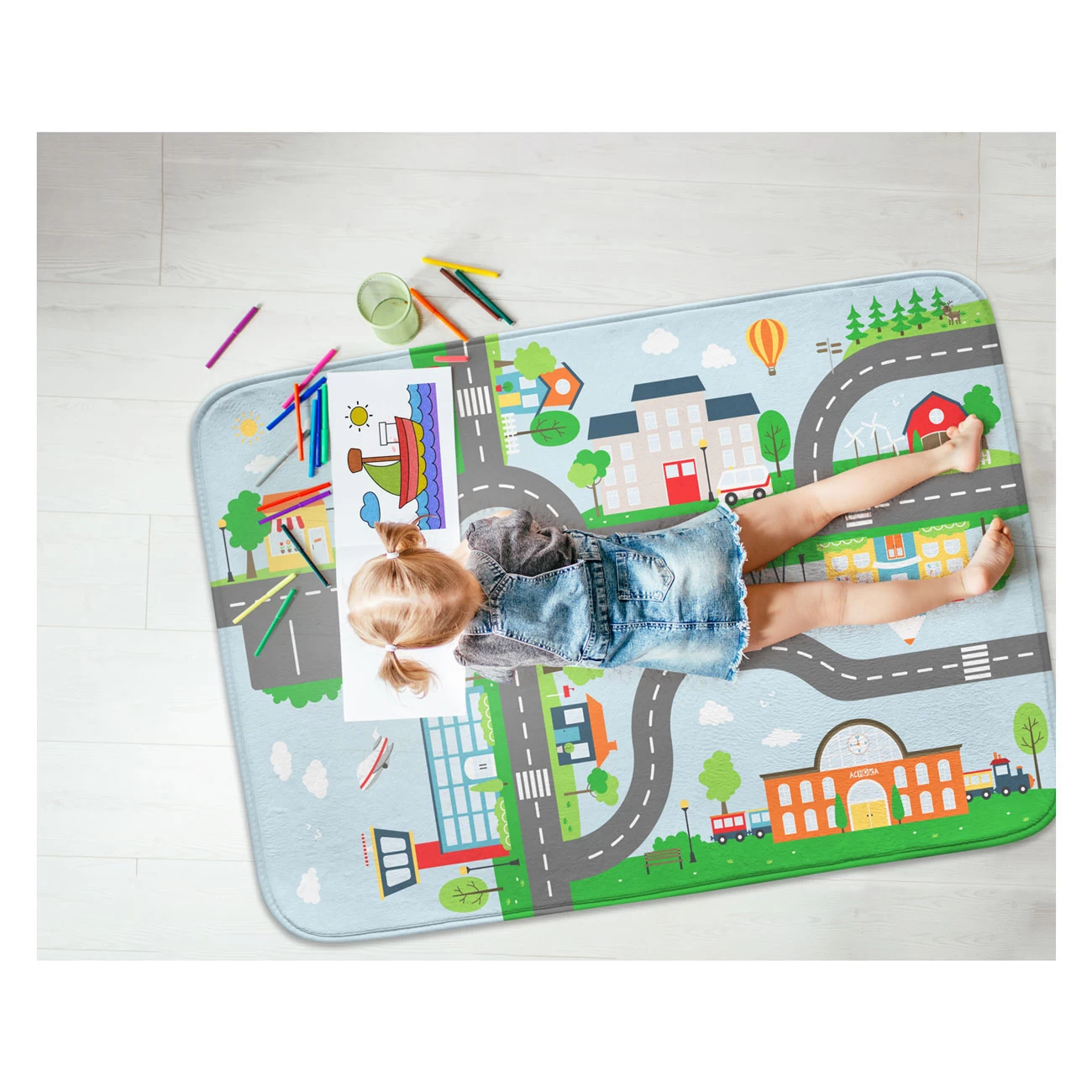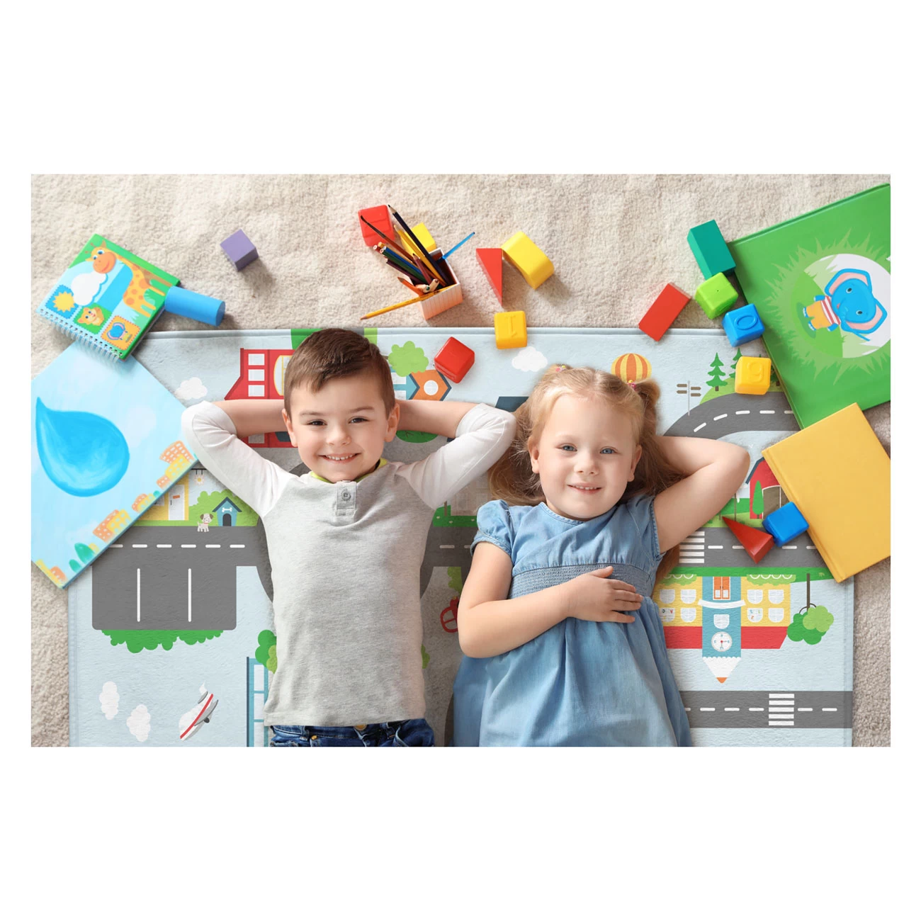 Entdecken Sie die Achoka Traffic & Airport Spielmatte: ein fantastisches Abenteuer in einer farbenfrohen Landschaft von 100 x 150 cm! Dieser wunderbar weiche Teppich ist perfekt für kleine Entdecker ab 18 Monaten. Tauchen Sie ein in eine Welt voller leuchtender Farben, in der Sie Ihre eigenen Geschichten über Straßen, einen Kreisverkehr mit Teich und sogar einen belebten Flughafen und Bahnhof erfinden können. Diese Spielmatte sorgt für stundenlangen Spielspaß, während Ihr Kleines die Welt des Verkehrs und der Flugzeuge erkundet. Lasst die Abenteuer beginnen!